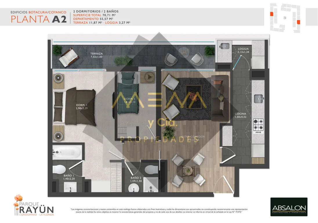 Estupendo departamento en segundo piso, de 56mts² útiles y 70mts² totales, 2 Dormitorios matrimonial con salida a terraza, 2 Baños modernos, principal en suite, Living comedor con salida a gran terraza de 11mts², cocina totalmente amoblada y equipada, amplia loggia. Valor incluye estacionamiento y Bodega. Gasto común $75.000 aprox. Edificio equipado con piscina, gimnasio, quincho, sala multiuso, estacionamiento de visitas. Cercano a Supermercados, colegios, locomoción. A pasos de Av. La Florida