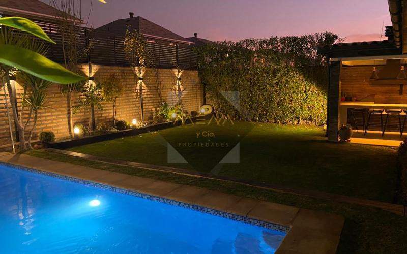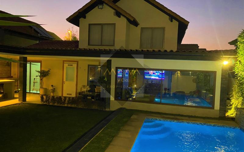 Hermosa casa solida de dos pisos en exclusivo condominio Costanera, en la comuna de Padre Hurtado, proyecto inmobiliario Laguna del Sol, de 4 dormitorios y 3 baños, 305mts² de terreno y 151mts² construidos. Con excelentes terminaciones, ventanas termopanel y paneles solares para la calefacción del agua. Cuenta con un gran patio y lindo Jardín, piscina privada con cascada e iluminación, riego automático, terraza y quincho.