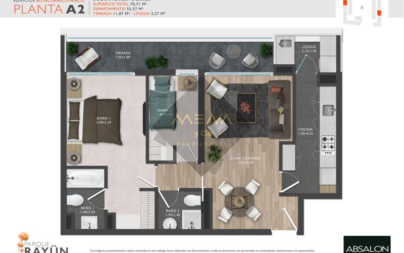 Estupendo departamento en segundo piso, de 56mts² útiles y 70mts² totales, 2 Dormitorios matrimonial con salida a terraza, 2 Baños modernos, principal en suite, Living comedor con salida a gran terraza de 11mts², cocina totalmente amoblada y equipada, amplia loggia. Valor incluye estacionamiento y Bodega. Gasto común $75.000 aprox. Edificio equipado con piscina, gimnasio, quincho, sala multiuso, estacionamiento de visitas. Cercano a Supermercados, colegios, locomoción. A pasos de Av. La Florida